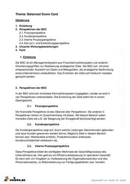 1 Einleitung 2 Perspektiven der BSC 2.1 Finanzperspektive 2.2 Kundenperspektive 2.3 Interne Prozessperspektive 2.4 Die Lern- und Entwicklungsperspektive 3 Ursache Wirkungsbeziehungen 4 Fazit |