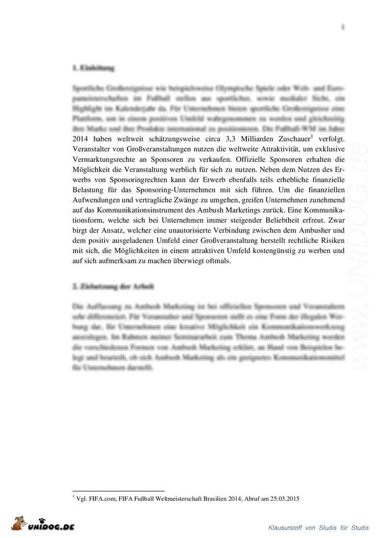 1. Einleitung. 2. Zielsetzung der Arbeit 3. Oberbegriff Guerilla-Marketing 3.1 Definition Ambush Marketing 3.2 Ziele Ambush Marketing 3.3 Sportsponsoring 4. Erscheinungsformen von Ambush Marketing 4.1 Differenzierung Ambush Marketing-Kategorien 4.2 Direktes Ambush Marketing 4.3 Indirektes Ambush Marketing 4.3 Dominant destruktiv-aggressives Ambush-Marketing 5. Beispiele für Ambush Marketing 5.1 Tennis Weltmeisterschaft 2009 in Wimbledon - Procter & Gamble 5.2 Olympische Spiele Atlanta 1996 - Puma 5.3 Fußball-Europameisterschaft 2012 - Paddy Power 5.4 Berlin Marathon 2006 6. Fazit