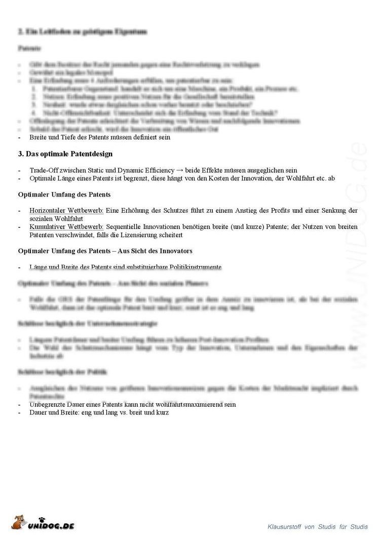 Dies ist die Zusammenfassung der Theorie der Vorlesung "Economics of Innovation" von Prof. Dr. Werner Bönte auf Deutsch. Diese habe ich knackig auf 10 Seiten zusammengefasst. Meine ausführliche Zusammenfassung auf Englisch mit Theorie und Erläuterung der Formeln umfasst 44 Seiten (nicht erschrecken!), da ich alles sehr ausführlich beschrieben und erklärt habe, um ein besseres Verständnis für den Sachverhalt zu vermitteln. Diese findet Ihr auch hier online ;) Die Zusammenfassung enthält alle relevanten Themen aus dem Vorlesungsskript, ergänzt durch Mitschriften aus der Vorlesung. Da die Klausur jedes Jahr direkt im Anschluss an die Vorlesungszeit geschrieben wird, sind aufgrund des Zeitmangels bis jetzt immer im WS die letzten Themengebiete ausgeschlossen worden. Im jeweiligen SS sind diese Themen hingegen klausurrelevant, in meiner Zusammenfassung jedoch nicht zu finden, da ich die Klausur im WS absolviert habe. Mithilfe meiner beiden Unterlagen habe ich eine sehr gute Note im WS15/16 erhalten und wünsche Euch genauso viel Erfolg! :)