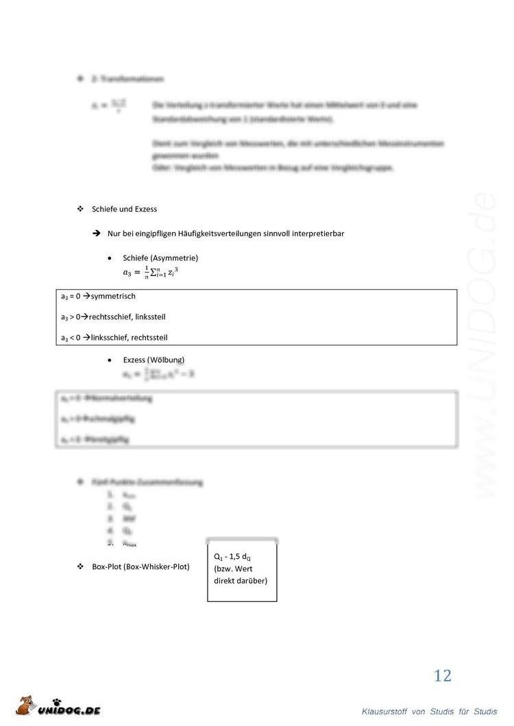 Sorgsam strukturierte Zusammenfassung zu Statistik I. Mit zahlreichen Illustrationen und Erklärungen zu den verschiedenen Formeln. Inhalt (mit Seitenzahlen): Univariate Deskriptivstatistik. 4 Definitionen. 4 Allgemein. 4 Arten von Variablen. 4 Skalenniveaus. 4 Nominalskaliert (= qualitativ/kategorial) 4 Ordinalskaliert (=qualitativ/Kategorial) 5 Intervallskaliert (=Metrisch) 5 Verhältnisskaliert (=Metrisch) 5 Absolutskaliert (=metrisch) 6 Häufigkeitsverteilung und -darstellung. 6 Häufigkeiten. 6 Häufigkeitsverteilung quasi-/Stetiger Variablen. 7 Häufigkeitsverteilung quasi-/stetiger variablen. 7 Kumulierte Häufigkeit/ Prozentrang. 7 Deskriptive univariate Auswertung à Ordinalskaliert 7 Lagemaße. 7 Gruppierte Daten. 7 Eigenschaften von Median Und Mittelwert 8 Dispersion –Streuung. 10 Nominalskalen. 10 Ordinalskalen. 10 Kardinalskaliert 11 Bivariate Deskription. 13 Zusammenhangsmaße bei metrischen Variablen. 13 Kovarianz. 13 Korrelation nach Bravais-Pearson (Produkt-Moment-Korrelation) 14 Zusammenhangsmaße bei ordinalskalierten Variablen. 14 Kendalls τ. 15 Wilsons E. 16 – Koeffizient 17 Zusammenhangsmaße bei nominalskalierten Variablen. 18 – Koeffizient 18 Cramérs V. 19 Zusammenhangsmaße bei dichotomen Variablen (nominalsklaliert) 19 Korrelationskoeffizient phi . 19 Wettquotientenverhältnis (odds ratio) 20 Q- Koeffizient von yule. 20 Regression. 21 Einfache lineare Regression. 21 Multiple Regression. 22 Partialkorrelationen. 23 Wahrscheinlichkeitstheorie. 23 Mengen und Mengenoperationen. 23 Wahrscheinlichkeit 24 Definitionen. 24 Laplace-Wahrscheinlichkeit 25 Bedingte Wahrscheinlichkeiten. 25 Binomialverteilung. 26 |