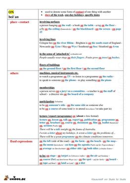 Umfangreiche Übersicht von Prepositions mit Beispielen und farblichen Hervorhebungen. |