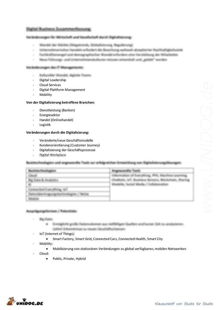Eine Zusammenfassung der klausurrelevanten Themen für die Klausur in "Grundlagen Digital Business". |