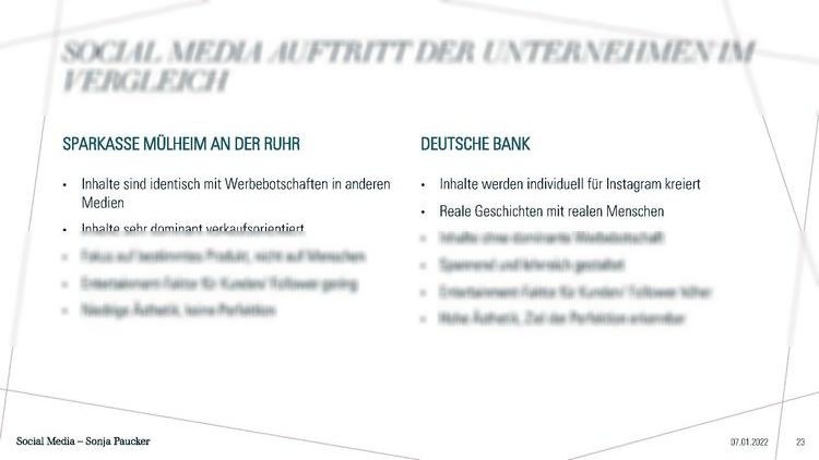 In der vorliegenden Power-Point Präsentation geht es um den strukturierten Vergleich von zwei Finanzdienstleistern in Ihrer Social Media-Arbeit. Die Präsentation wurde für das Modul Unternehmenskommunikation erstellt und online vorgetragen. Die einzelnen Punkte wurden verbal untermauert und erheben keinen Anspruch auf Vollständigkeit. Die Aufbereitung der Präsentation erfolgte zunächst als Power-Point, ist jedoch hier als pdf abrufbar, da sie auch so im OC hochgeladen wurde. |