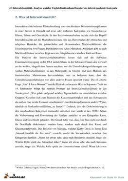 In dieser Hausarbeit wird der Begriff Intersektionalität zunächst näher definiert und dargestellt. Dabei wird auf die Problematik der Hierarchisierung, Ausblendung und Abwertung von Kategorien einschließlich der Auswahl und Gewichtungen von Kategorien eingegangen. Die Debatte der Intersektionalität hat viele historische Vorläufer. Daher soll zunächst der Blickwinkel auf die viel zitierte Frage „Ain’t I a Woman“ aus der Rede der Sklavin Sojourner Truth im Jahr 1851 gerichtet werden. Denn diese Frage zeigt wie der Feminismus in Amerika mit dem Thema „Rasse“ umgegangen ist und sie lässt sich auf alle anderen Bereiche übertragen. Nach dieser kleinen Analyse im Bereich der Kritik am Patriarchat in Amerika soll die Kritik an der 2. Frauenbewegung in Deutschland seitens der Frauen mit Behinderungen, Migrantinnen, Jüdinnen und Schwarzen Frauen analysiert werden. Denn die Eindimensionalität in den Frauenbewegungen in Deutschland lässt auch den aufgezählten Frauengruppen die Frage von Sojourner Truth mehrmals wiederholen. Abschließend wird die Theorie von Katharina Walgenbach „Gender als interdependente Kategorie“ behandelt, die auf die Problemsituationen der zu vorigen Punkte eingeht. Die Analyse sozialer Ungleichheiten soll anhand Gender als interdependente Kategorie abgeschlossen und als Lösung dargestellt werden.