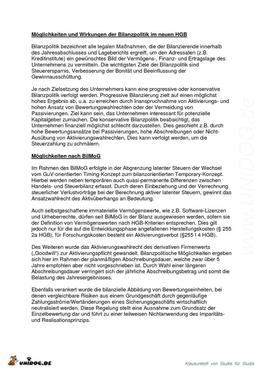 Knapp 1,5-seitiges Dokument. Steigt ein mit kurzer Definition sowie Zielen der Bilanzpolitik, beschreibt die neuen Möglichkeiten nach BilMoG und schließt ab mit deren Wirkung auf den Jahresabschluss |