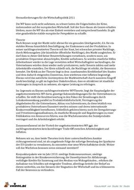 Die WP kann noch nicht aufatmen, zu schwer lasten die Folgeschäden der Krise, insbesondere auf der europäischen Wirtschaft. Soll der Euro-Raum als Ganzes erhalten bleiben, muss die WP ihn als eine Einheit verstehen und entsprechend handeln. Es gilt eine ganzheitliche stabile europäische Perspektive zu schaffe. Theorie Nach Keynes sorgt der Markt nicht alleine für ein gesundes Gleichgewicht, d.h. für ein stabiles Niveau hinsichtlich Beschäftigung, der Einkommen und der Produktion. ... |