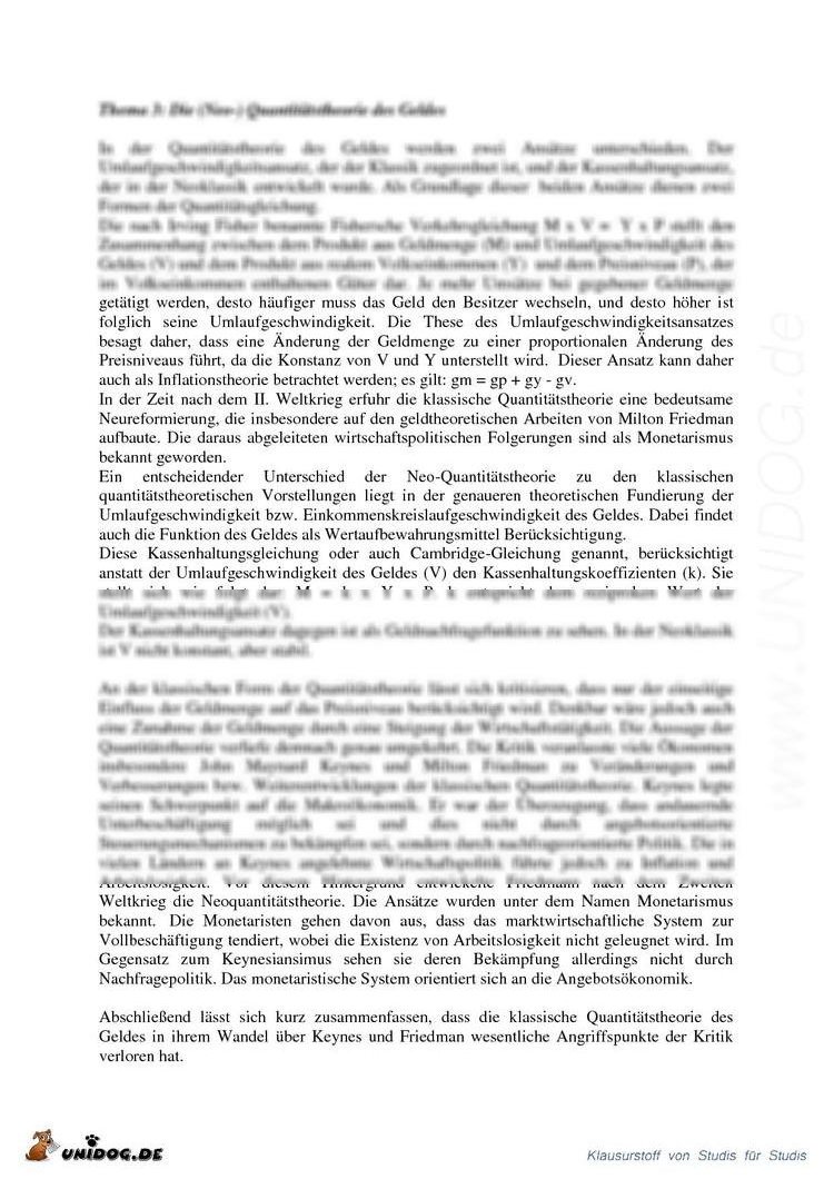 Mein Abstract über das Thema "Die (Neo-) Quantitätstheorie des Geldes". Bei uns wurde ein anderes Thema geschrieben, allerdings habe ich alle 4 Themen detailliert ausgearbeitet. |