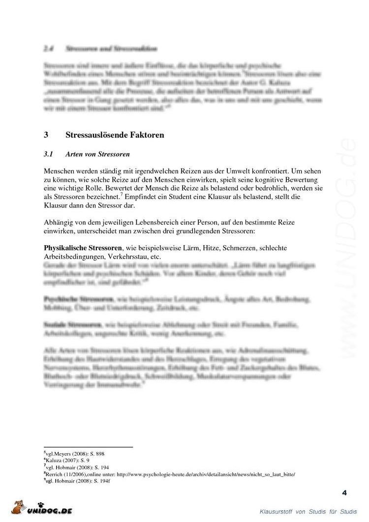 Der Faktor Stress ist in unserer heutigen Gesellschaft ein großes Thema und tritt in jeder Altersgruppe und in allen sozialen Schichten auf. Warum wir gerade dieses Thema ausgewählt haben, liegt auf der Hand. Studenten leiden sehr oft unter Stress – egal ob unter Leistungs-, Prüfungs- oder Zeitdruck. All diese Dinge wirken sich negativ auf das Leben und die Leistungsfähigkeit aus und die Folgen sind Kopfschmerzen, Nervosität, Gereiztheit, Schlafstörungen, u.a. Anstatt aber den Stress und die Ursachen zu bekämpfen, versucht man sie zu unterdrücken, in dem man zu Zigaretten, Alkohol oder Schlaf- und Beruhigungsmitteln greift, um den Stress und das Befinden für eine Zeit lang zu betäuben. Stress kann man aber nicht betäuben, er muss gezielt und wirksam abgebaut werden. In unserer Seminararbeit möchten wir auf das Phänomen Stress genauer eingehen, seine Auswirkungen auf die menschliche Gesundheit und Leistung erläutern und anschließend einige Handlungsmöglichkeiten aufzuzeigen, um den Alltagsstress besser bewältigen zu können. |