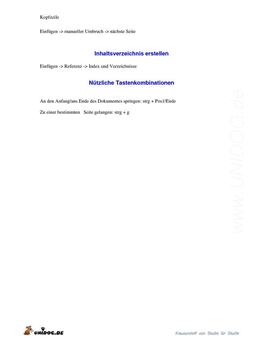 -Formatieren von Überschriften -Fortlaufende Nummerierung erstellen -Dokumentvorlagen erstellen -Inhaltsverzeichnis erstellen -Kopfzeilen und Fußzeilen einrichten -Index erstellen -Abbildungsverzeichnis erstellen |