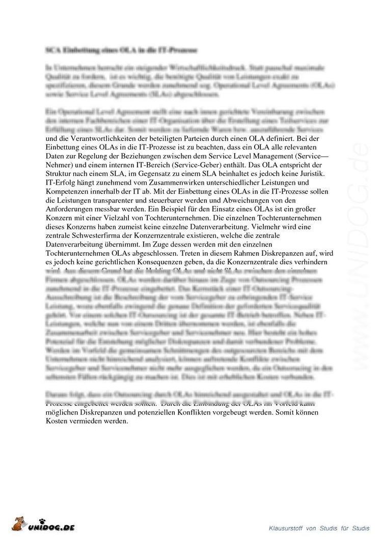 Hier findet ihr einen Abstract über das schwer zu recherchierende Thema im Modul Projektmanagement "Einbettung eines OLA´s in die IT-Prozesse). Passt handschriftlich genau auf 2 Seiten, bei einer normalen Schrift.