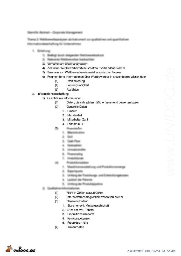 Stichpunktliste zum Abstract-Thema "Wettbewerbsanalysen als Instrument zur qualitativen und quantitativen Informationsbeschaffung für Unternehmen" im Fach Corporate Management. |