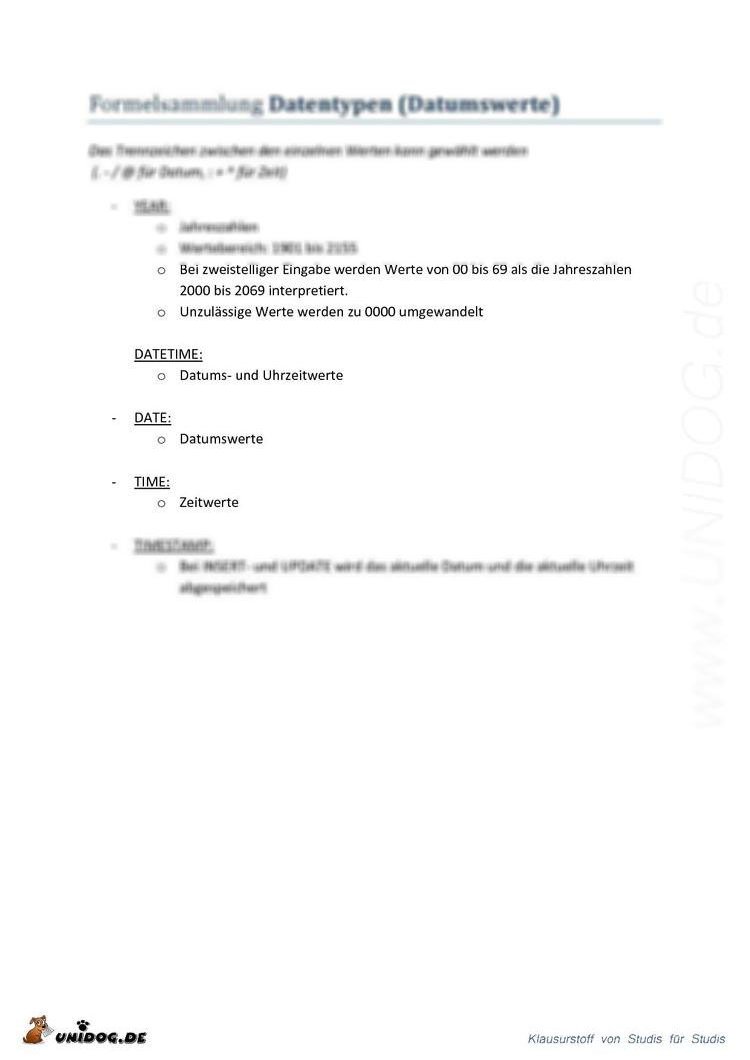Zusätzlich zu dieser Zusammenfassung kann auch ein Fragenkatalog "Fragen zur Zusammenfassung - Datenbankmanagement" und die dazugehörigen Lösungen heruntergeladen werden. |