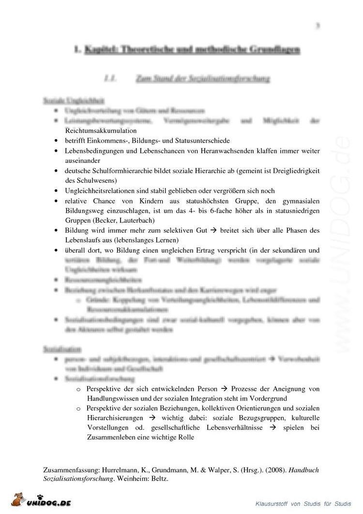 Dies ist eine Zusammenfassung des Werkes "Handbuch der Sozialisationsforschung" von Hurrelmann und Walper.