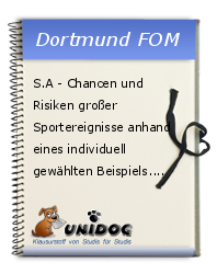 Aufgabenstellung: Diskutieren Sie jeweils zwei Chancen und zwei Risiken großer Sportereignisse für das Gastgeberland anhand eines individuell von Ihnen gewählten Beispiels. Wenn auf dem vorgegebenem FOM-Papier sehr klein handschriftlich geschrieben wird, ergibt diese Ausarbeitung exakt 2 DIn A 4 Seiten inklusive Absätze für einen strukturierten Überblick. Da dieses Thema nicht gezogen wurde, kann ich keine erzielte Note nennen. Zum Vergleich: Bei dem gezogenen S.A. habe ich eine 1,0 erzielt (Thema: Chancen und Risiken von Lerngruppen zur Vorbereitung auf ein von Ihnen konkret zu schreibendes Scientific Abstract im Fach Management Basics.) |